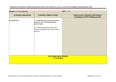 RANCANGAN PENGAJARAN TAHUNAN PENDIDIKAN SENI VISUAL KSSR TAHUN 5_DPK 2.0 2021_ SK API API KOTA KINABALU_DARSAHANEE BIN YUSOP