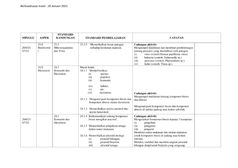 MINGGU ASPEK KANDUNGAN STANDARD PEMBELAJARAN CATATAN