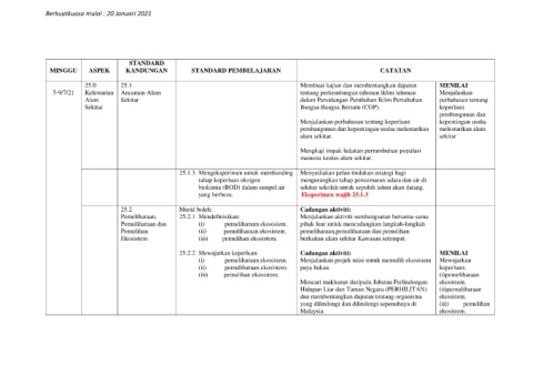 MINGGU ASPEK KANDUNGAN STANDARD PEMBELAJARAN CATATAN