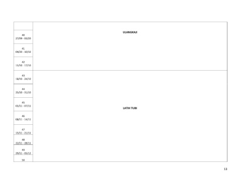 ULANGKAJI 40 27/09 - 03/20 41 04/20 - 10/10 42 11/10 - 17/10 43 18/10 - 24/10 44 25/10 - 31/10 45 01/11 - 07/11 LATIH TUBI 46 08/11 - 14/11 47 15/11 - 21/11 48 22/11 - 28/11 49 29/11 - 05/12 50 13