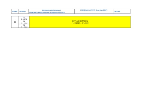 STANDARD KANDUNGAN / CADANGAN AKTIVITI (merujuk DSKP) BULAN MINGGU CATATAN STANDARD PEMBELAJARAN/ STANDARD PRESTASI 50 6 – 12/12 CUTI AKHIR TAHUN 51 12 13 – 19/12 11.12.2021 – 3.1.2022 52 20 – 26/12