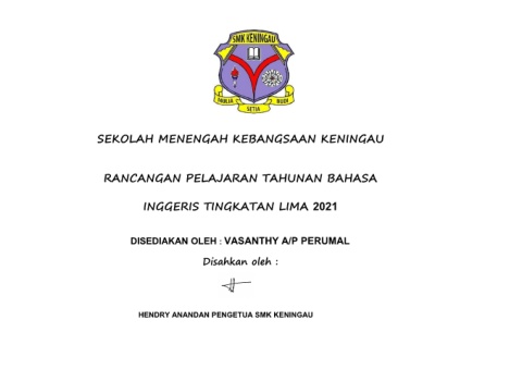 SEKOLAH MENENGAH KEBANGSAAN KENINGAU RANCANGAN PELAJARAN TAHUNAN BAHASA INGGERIS TINGKATAN LIMA 2021 DISEDIAKAN OLEH : VASANTHY A/P PERUMAL Disahkan oleh : HENDRY ANANDAN PENGETUA SMK KENINGAU