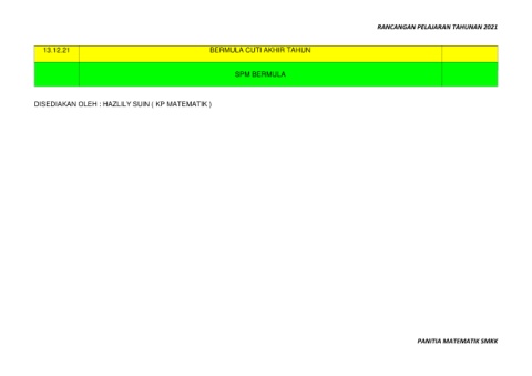 RANCANGAN PELAJARAN TAHUNAN 2021 13.12.21 BERMULA CUTI AKHIR TAHUN SPM BERMULA DISEDIAKAN OLEH : HAZLILY SUIN ( KP MATEMATIK ) PANITIA MATEMATIK SMKK