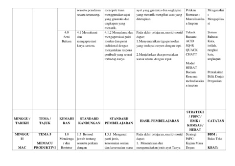 MINGGU / TEMA / KEMAHI STANDARD STANDARD HASIL PEMBELAJARAN EMK / CATATAN