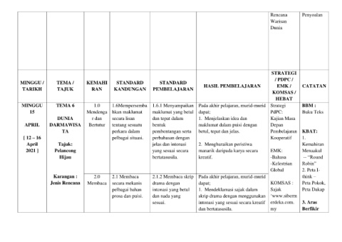 MINGGU / TEMA / KEMAHI STANDARD STANDARD HASIL PEMBELAJARAN EMK / CATATAN