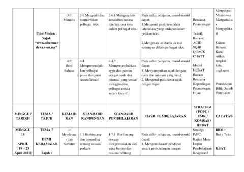 secara kreatif intonasi yang sesuai 2. Mengenal pasti tema sajak Rencana