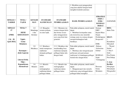 MINGGU / TEMA / KEMAHI STANDARD STANDARD HASIL PEMBELAJARAN EMK / CATATAN