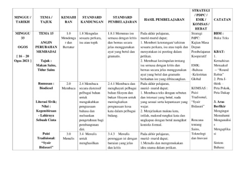 MINGGU / TEMA / KEMAHI STANDARD STANDARD HASIL PEMBELAJARAN EMK / CATATAN