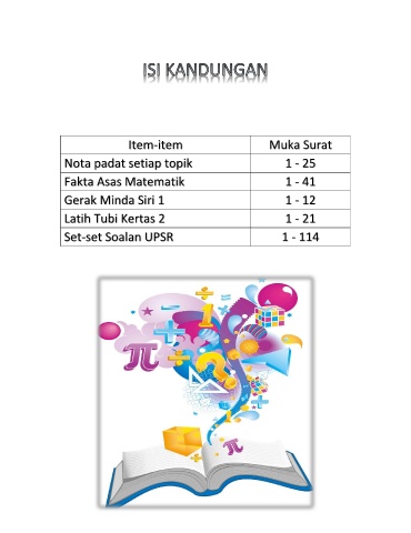 Item-item Muka Surat Nota padat setiap topik 1 - 25 Fakta Asas Matematik 1 - 41 Gerak Minda Siri 1 1 - 12 Latih Tubi Kertas 2 1 - 21 Set-set Soalan UPSR 1 - 114
