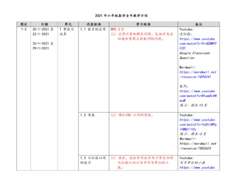 2021 年六年级数学全年教学计划