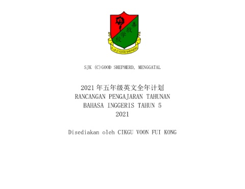 SJK (C)GOOD SHEPHERD, MENGGATAL 2021 年五年级英文全年计划 RANCANGAN PENGAJARAN TAHUNAN BAHASA INGGERIS TAHUN 5 2021 Disediakan oleh CIKGU VOON FUI KONG