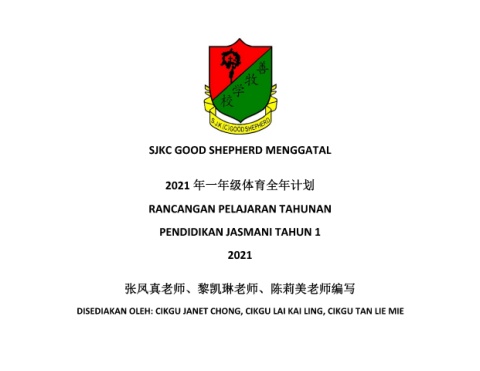 SJKC GOOD SHEPHERD MENGGATAL 2021 年一年级体育全年计划 RANCANGAN PELAJARAN TAHUNAN PENDIDIKAN JASMANI TAHUN 1 2021 张凤真老师、黎凯琳老师、陈莉美老师编写 DISEDIAKAN OLEH: CIKGU JANET CHONG, CIKGU LAI KAI LING, CIKGU TAN LIE MIE
