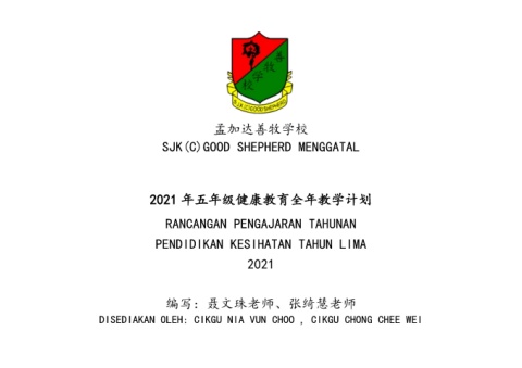 孟加达善牧学校 SJK(C)GOOD SHEPHERD MENGGATAL 2021 年五年级健康教育全年教学计划 RANCANGAN PENGAJARAN TAHUNAN PENDIDIKAN KESIHATAN TAHUN LIMA 2021 编写:聂文珠老师、张绮慧老师 DISEDIAKAN OLEH: CIKGU NIA VUN CHOO , CIKGU CHONG CHEE WEI