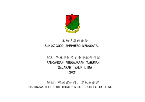 按 孟加达善牧学校 SJK(C)GOOD SHEPHERD MENGGATAL 2021 年五年级历史全年教学计划 RANCANGAN PENGAJARAN TAHUNAN SEJARAH TAHUN LIMA 2021 编制:张燕霞老师、黎凯琳老师 DISEDIAKAN OLEH CIKGU CHONG YEN HA, CIKGU LAI KAI LING