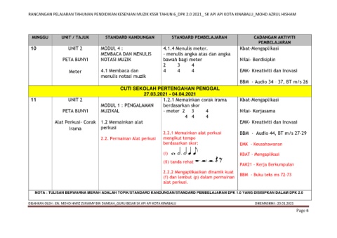 RANCANGAN PELAJARAN TAHUNAN PENDIDIKAN KESENIAN MUZIK KSSR TAHUN 6_DPK 2.0 2021_ SK API API KOTA KINABALU_MOHD AZRUL HISHAM