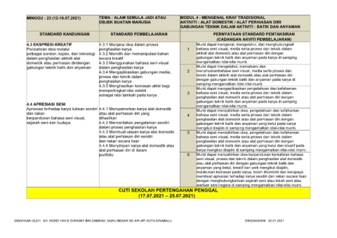 MINGGU : 23 (12-16.07.2021) TEMA : ALAM SEMULA JADI ATAU MODUL 4 : MENGENAL KRAF TRADISIONAL