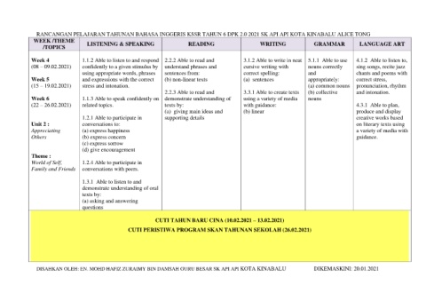 RANCANGAN PELAJARAN TAHUNAN BAHASA INGGERIS KSSR TAHUN 6 DPK 2.0 2021 SK API API KOTA KINABALU ALICE TONG