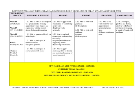RANCANGAN PELAJARAN TAHUNAN BAHASA INGGERIS KSSR TAHUN 6 DPK 2.0 2021 SK API API KOTA KINABALU ALICE TONG