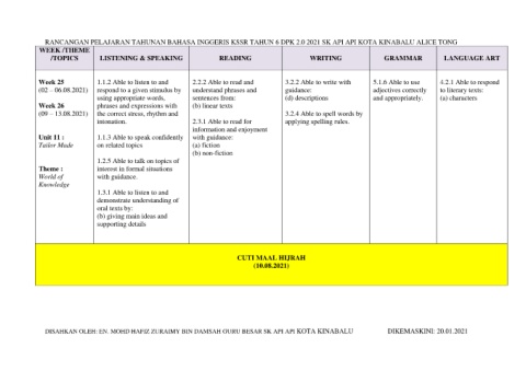 RANCANGAN PELAJARAN TAHUNAN BAHASA INGGERIS KSSR TAHUN 6 DPK 2.0 2021 SK API API KOTA KINABALU ALICE TONG