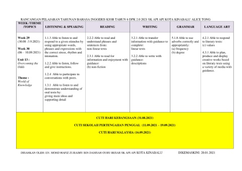 RANCANGAN PELAJARAN TAHUNAN BAHASA INGGERIS KSSR TAHUN 6 DPK 2.0 2021 SK API API KOTA KINABALU ALICE TONG