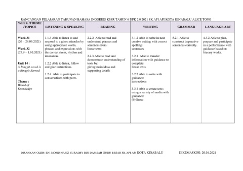 RANCANGAN PELAJARAN TAHUNAN BAHASA INGGERIS KSSR TAHUN 6 DPK 2.0 2021 SK API API KOTA KINABALU ALICE TONG