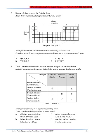 Jadual 2 menunjukkan keputusan tindak balas antara halogen dan larutan halida.