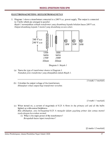 Rajah 1 menunjukkan sebuah transformer yang disambung kepada bekalan kuasa 240 V a.u.