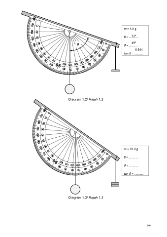 m = 5.0 g o 71 β = ………… 19 o β θ = ………… 0.344 tan θ = ………… Diagram 1.2/ Rajah 1.2 m = 10.0 g β = ………… θ = ………… tan θ = ………… Diagram 1.3/ Rajah 1.3 394