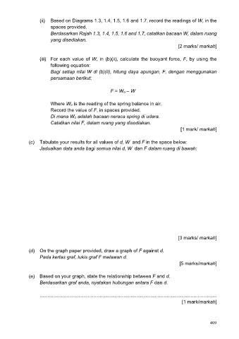 Bagi setiap nilai W di (b)(ii), hitung daya apungan, F, dengan menggunakan