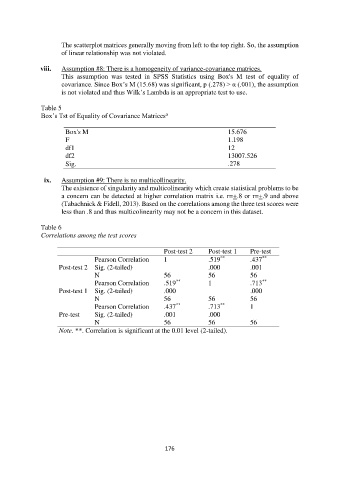 covariance. Since Box’s M (15.68) was significant, p (.278) > α (.001), the assumption