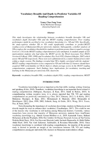 Keywords: vocabulary breadth (VB); vocabulary depth (VD); reading comprehension; MUET