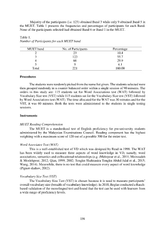 the MUET. Table 1 presents the frequencies and percentages of participants for each Band.