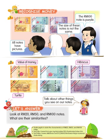 TEACHER’S • Guide pupils to state the characteristics of RM20, RM50, and RM100 4.1.1