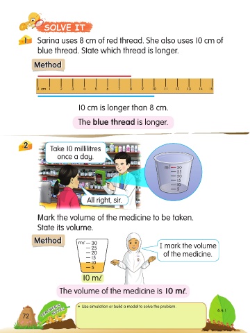 The volume of the medicine is 10 mℓ. His brotherʼs height is about 80 cm.