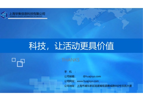 科技,让活动更具价值 THANKS 手 机 : 公司邮箱: @huajisys.com 公司网址:www.huajisys.com 公司地址:上海市浦东新区陆家嘴街道商城路660号乐凯大厦 上海华集信息科技有限公司 SHANGHAI HUAJISYS INFORMATION TECHNOLOGY