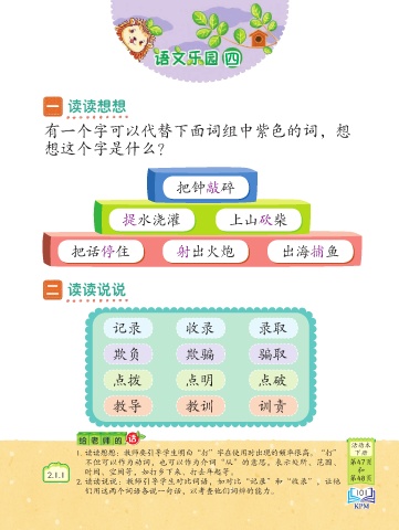 1. 读读想想:教师要引导学生明白“打”字在使用时出现的频率很高。“打” 下册