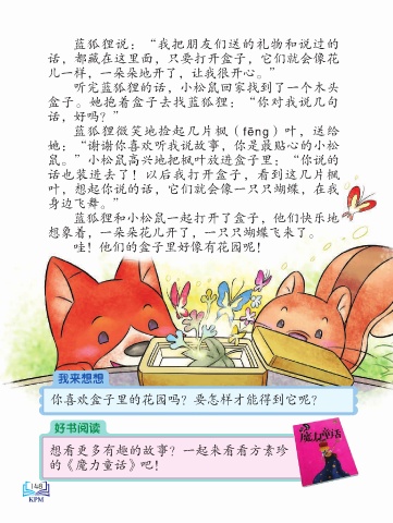 蓝狐狸和小松鼠一起打开了盒子,他们快乐地