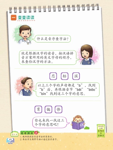 一 查查读读 什么是音序查字法? 就是根据汉字的读音,按汉语拼 音方案所用的英文字母的顺序, 来查检汉字的方法。 悲 标 滨 以上三个字的声母都是“b”,找到 “b”后,再根据音节“b´i”“biåo” “bˆn”找到这三个字的意思。 育 偏 惨 你也来找一找这三 个字的意思吧! 字典 活动本 上册 第78页 给 老 师 的 话 至 2.1.1 第84页 1. 教师强调音序查字法的重要性。 60 2. 要求学生携带字典以通过音序查字。 KPM KP M