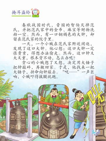 掩耳盗铃 扫一扫 春秋战国时代,晋国的智伯灭掉范 氏,并把范氏家中的金币、珠宝等财物洗 劫一空。然而,有一口铜褐色的大钟,却 留在范氏家的院子里。 一天,一个小贼在范氏家附近闲逛, 发现了这口大钟。他心想:这口大钟一定 很贵重,得想办法偷走。然而,这口钟又 大又重,根本背不动,怎么办呢? 贪心的小贼想了又想,决定用大锤子 把钟敲碎,再搬回家。于是,他找来一把 大锤子,拼命向钟敲去。“咣——”一声巨 响,小贼吓得拔腿就跑。 85 KPM KP M