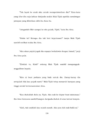 “Janganlah fikir sampai ke situ pulak, Tijah,” kata ibu Aina.