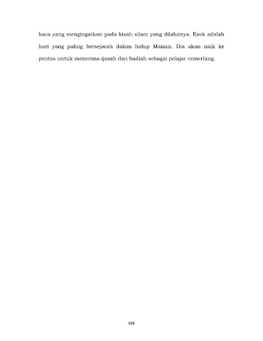 kaca yang mengingatkan pada kisah silam yang dilaluinya. Esok adalah hari yang paling bersejarah dalam hidup Maizan. Dia akan naik ke pentas untuk menerima ijazah dan hadiah sebagai pelajar cemerlang. 108
