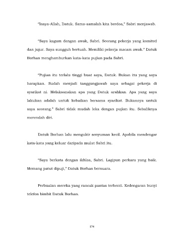 dan jujur. Saya sungguh bertuah. Memiliki pekerja macam awak.” Datuk