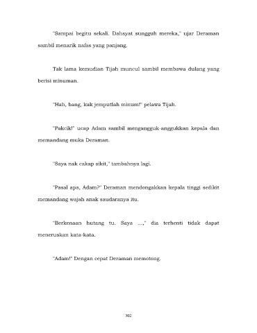 "Pasal apa, Adam?" Deraman mendongakkan kepala tinggi sedikit