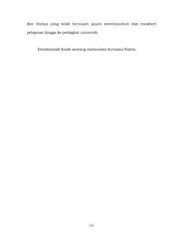 dan ibunya yang telah bersusah payah membesarkan dan memberi pelajaran hingga ke peringkat universiti. Demikianlah kisah seorang mahasiswa bernama Nazim. 317