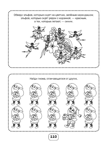 Обведи эльфов, которые сидят на цветках, зелёным карандашом; эльфов, которые сидят рядом с корзиной, — красным, а тех, которые летают, — синим. Найди гнома, отличающегося от других. 110