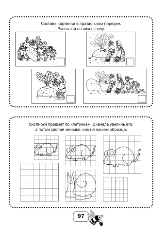 Составь картинки в правильном порядке. Расскажи по ним сказку. Скопируй предмет по клеточкам. Сначала увеличь его, а потом сделай меньше, как на нашем образце. 97