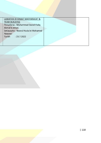 LAWATAN KHIDMAT MASYARAKAT & TEAM BUILDING Penyelaras : Muhammad Daneil Faliq Akmal b Johari Setiausaha : Noorul Huda bt Mohamed Nawawi Tarikh : 23.7.2022 | 118