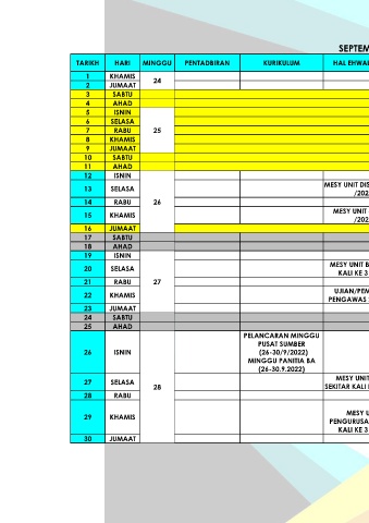 TARIKH HARI MINGGU PENTADBIRAN KURIKULUM HAL EHWAL MURID KOKURIKULUM PRASEKOLAH CATATAN