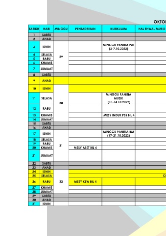 TARIKH HARI MINGGU PENTADBIRAN KURIKULUM HAL EHWAL MURID KOKURIKULUM PRASEKOLAH KAUNSELING CATATAN
