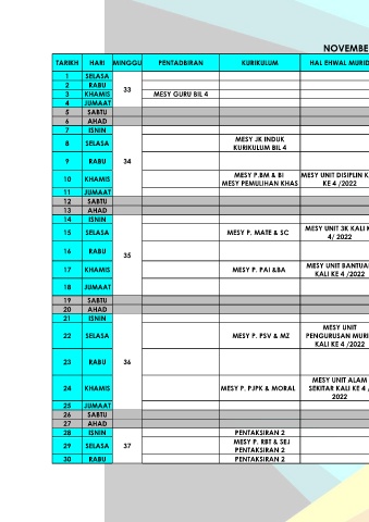TARIKH HARI MINGGU PENTADBIRAN KURIKULUM HAL EHWAL MURID KOKURIKULUM PRASEKOLAH CATATAN